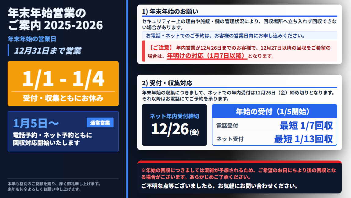 インターネットからの回収お申込みは、回収希望日から3営業日前の15:00までに行ってください。